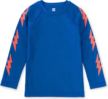 Built for active swim days and long hours in the sun, this Bolt Sleeve Rash Guard delivers reliable coverage with a sporty edge. The fitted silhouette features long raglan sleeves and a lined front bodice for comfortable movement in and out of the water, while UPF 50+ sun protection helps cut down on sunscreen during busy beach or pool days. Crafted from recycled materials and finished with bold lightning bolt graphics down the sleeves, it's a durable swim essential made to keep up with every splash. Mix and match easily with our swim trunks or bikini bottoms for a sun-smart look that lasts swim after swim.