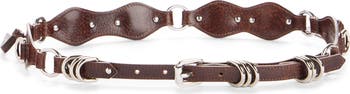 A scalloped-leather belt connected with ring hardware and accented with D-ring loops highlights the French designer's signature bohemian-rock aesthetic.