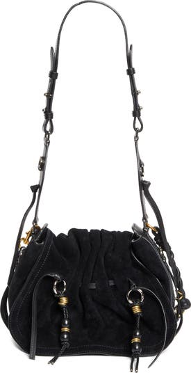 The Parisian-based designer polishes her boho creds with this suede hobo bag designed in a drawstring-cinched slouchy silhouette detailed with beaded tassels. A braided top handle and adjustable shoulder strap offer carrying options.