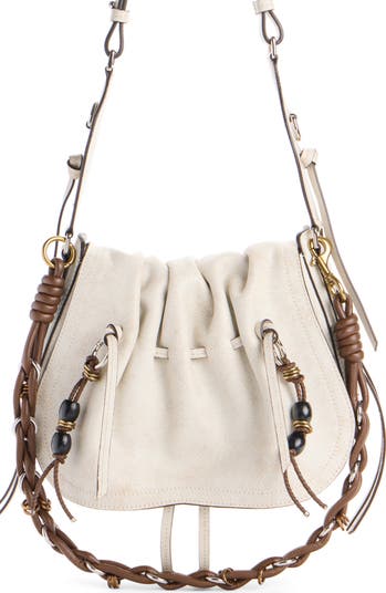 The Parisian designer polishes her bohemian credentials with this washed-leather shoulder bag featuring a drawstring-cinched slouchy silhouette and beaded tassels. A braided top handle and adjustable shoulder strap offer carrying options.