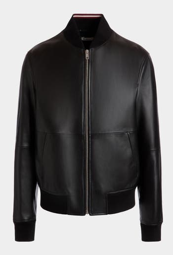 Cool and essential, this bomber jacket in black Nappa lambskin is fastened at the front by a metal zipper. Stretch knit fabric trims the cuffs, lower hem and collar, which is embellished by a red and white Bally Ribbon on the inside.