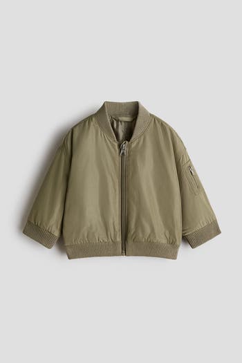 Lightly padded bomber jacket in woven fabric with a low, ribbed collar. Zip down the front with an anti-chafe chin guard, a zipped sleeve pocket and ribbing at the cuffs and hem. Lined.