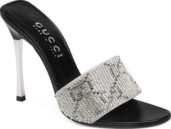 A mirrored metallic stiletto and crystal-sparkled GG mesh on a silk-satin strap make it easy to shine in this Italian-leather sandal worn by both La Bomba No. 2 and La Drama Queen characters in Demna's 'La Famiglia' collection.