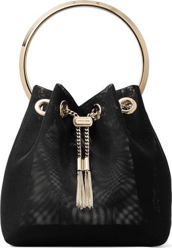 The signature Bon Bon bag is given a contemporary refresh in airy mesh with a polished ring handle, slinky chains and a tassel-tipped drawstring.
