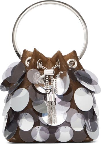 Oversized paillettes scale this softly structured pouch that makes a glamorous statement with chain tassels and a sculpturally circular handle.