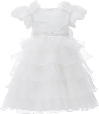The Bonaventura ruffle dress is a stunning and elegant choice for any special occasion. A ruffle bodice with puff sleeves, round neck, satin belt tied in the back with a voluminous tulle ruffle skirt.