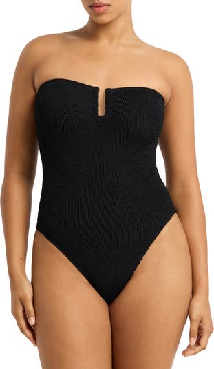 A stretchy texture lends depth to this strapless one-piece swimsuit with U-bar hardware and high-cut legs that create a stunning silhouette.