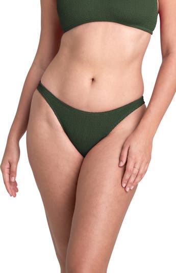 Stretchy and resilient ribbed fabric enhances the throwback '80s vibe of these bikini bottoms styled with a curved cut that can be worn high or low on the hip.