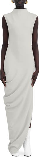 Soft ruching drapes elegantly on this figure-skimming maxi cut from shape-retaining ponte fabric and topped with a sophisticated high neckline.