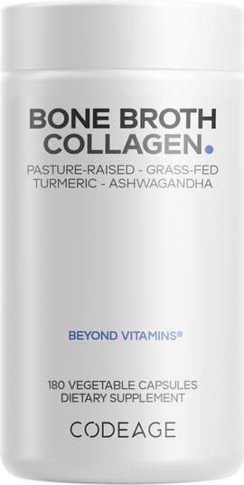 - Codeage Grass-Fed Bone Broth Collagen supplement features organic, pasture-raised beef and free-range chicken, delivering a blend of type 1, 2, and 3 collagen. This formula is available in a convenient capsule format.