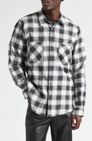 This overshirt plays in monochrome but never fades into the background. A crisp black-and-white plaid sets the base, then the label’s bone motifs strike down the sleeves for instant attitude. Glossy black snaps add a sleek hit at the placket and the frayed hem seals the grunge mood.