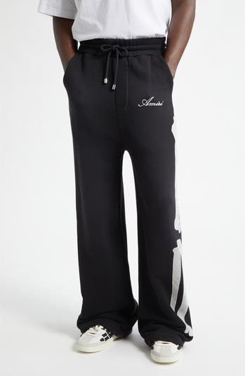 The label's signature 'bones' embroidery transforms these classic wide-leg sweatpants into an edgy, luxury streetwear piece with a distinctive rock-'n'-roll aesthetic.