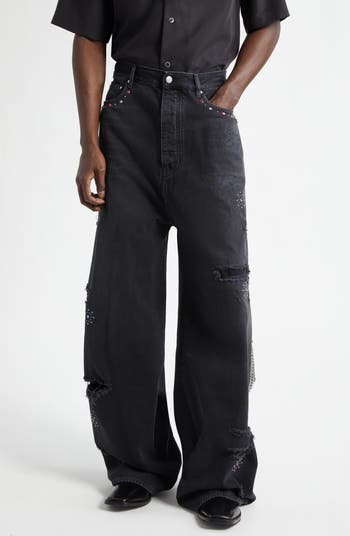 The label's signature 'bones' are updated as croc-embossed leather appliqués, transforming these rip-and-repair, baggy-fit jeans into an edgy, luxury streetwear piece with a distinctive rock-'n'-roll aesthetic. Crystal rivets and starburst stud embellishments make the style even more memorable.