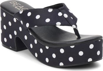 Wide straps and a center toe post distinguish a lofty flip-flop set on a chunky platform and block heel for dramatic height.