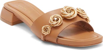Polished rosette hardware adds an extra touch of contemporary sophistication to this comfort-cushioned slide sandal.