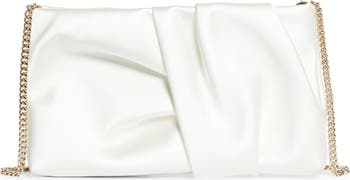 Artfully pleated and folded satin showcases the label's impeccable craftsmanship in a glamorous clutch that can also be styled with a detachable chain strap.
