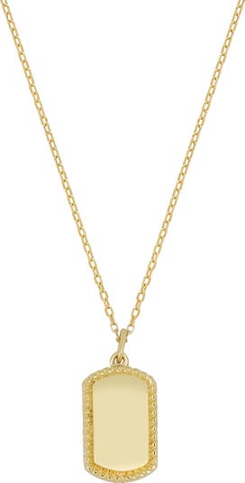 Part of our online trunk show, this style is available for a limited time From July 12 through August 3. This delicate and dainty 14-karat-gold necklace shines with attention-getting gleam thanks to the smooth tag pendant framed in light-bending ropelike texture.