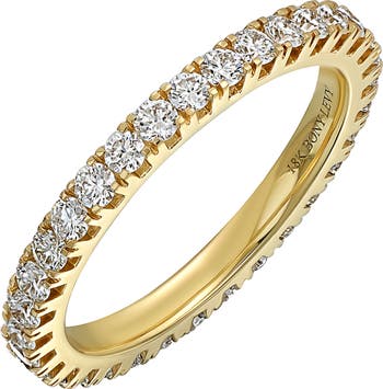 A shimmering row of 33 prong-set diamonds encircles the slender band of an eternity ring handcrafted from 18-karat gold.