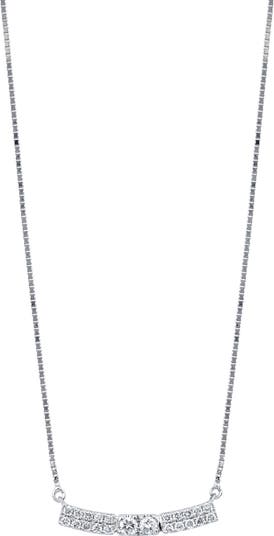 A curved bar pendant adorned with two large center diamonds flanked by smaller diamonds creates brilliant shine on this handcrafted 18-karat-gold necklace.