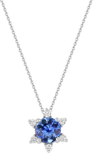 A central sapphire and six diamonds create a starburst of shine at the center of this 18-karat gold necklace.