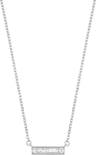 Part of our online trunk show, this style is available for a limited time From July 12 through August 3. A mix of round- and baguette-cut diamonds bring mesmerizing sparkle to the bar pendant of this necklace handcrafted of 18-karat gold.