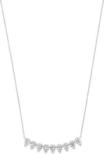 Round and baguette diamonds illuminate a line of pear-shaped stations in this graceful, deco-inspired collar necklace that sparkles in 18-karat white gold.