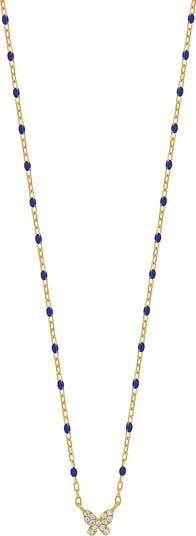 A handcrafted 14-karat-gold chain necklace interspersed with color-popping enamel beads holds a dainty butterfly pendant shining with pavé diamonds.