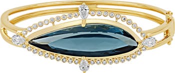 Part of our online trunk show, this style is available for a limited time From July 12 through August 3. A dazzling halo of 40 diamonds adds to the majestic appeal of this 18-karat-gold bracelet set with magnificent marquis-cut London blue topaz.