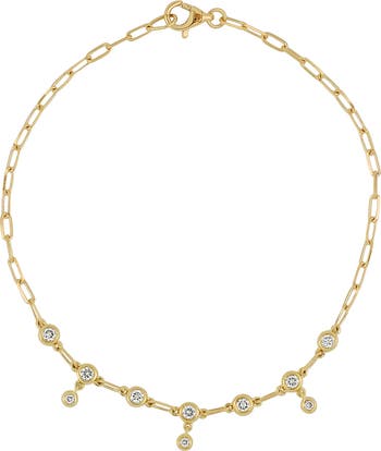 Round diamond bezels dazzle and dangle along this delicate chain bracelet handcrafted from 18-karat gold.