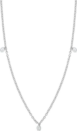 Three stations sparkle with oval-cut diamonds on this stunning necklace rendered from 18-karat white gold.