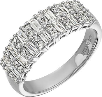 Round and baguette-cut diamonds are aglow in this statement-making ring handcrafted from 18-karat gold.