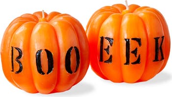Spread some Halloween cheer with this set of Boo Eek Pumpkin Candles. Made from paraffin wax and shaped like pumpkins, these candles feature the words "boo" and "eek" for a playful and festive touch.
