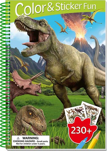 BOOK N APP PAPPLISHING HOUSE: DINOSAURS STICKER & COLORING BOOK - Discover creative dinosaur adventures with this Sticker & Coloring Book from the Color & Sticker Fun series. Featuring exciting prehistoric scenes, this book encourages learning through creative play. REUSABLE STICKERS: Designed for kids ages 4+, it combines detailed coloring pages with over 230 reusable stickers for interactive play. 3D EFFECT: The lenticular cover features a subtle shifting 3D effect that changes when viewed from different angles, adding visual depth and interest. Inside, kids can color prehistoric illustrations and use repositionable stickers to build and rebuild their own dinosaur worlds again and again. SCREEN-FREE ENTERTAINMENT: Perfect for quiet time, travel, classroom activities or screen-free fun at home, this activity book keeps young dinosaur fans engaged while encouraging imagination and creative storytelling. Reusable stickers and coloring pages encourage hands-on creativity, making every adventure unique. MAKES A GREAT GIFT: A great gift idea for birthdays, holidays or any child who loves T-Rex and prehistoric adventures. INCLUDES: 1 Activity Book (56 Pages, Including 2 Sticker Pages) with Reusable Stickers.