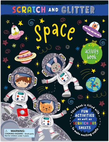 BOOK N APP PAPPLISHING HOUSE: SPACE SCRATCH ART ACTIVITY BOOK - Explore the universe with this Scratch & Glitter Space Scratch Art Activity Book. Designed for kids ages 4+, it features 28 exciting activity pages, 4 holographic scratch sheets and a wooden scratch stylus included. Young explorers can discover planets, stars, and cosmic wonders while expressing creativity through hands-on art. RAINBOW & GLITTER EFFECTS: As children scratch the special pages, brilliant rainbow and glitter foil effects appear, revealing rockets, astronauts and cosmic designs. The DIY scratch crafts at the back of the book add even more creative fun. SCREEN-FREE ENTERTAINMENT: The large 8.46 x 11 inch format makes it ideal for travel, quiet time or screen-free entertainment at home. Kids can discover space in a colorful, hands-on way. MAKES A GREAT GIFT: A great gift for young explorers who love space adventures and creative scratch art. Perfect for birthdays, holidays, or any occasion that celebrates curiosity and artistic discovery. INCLUDES: 1 Activity Book (8.46 X 11 In) with 28 Activity Pages, 4 Holographic Scratch Sheets, 1 Wooden Scratch Stylus.