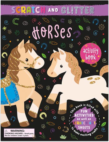 BOOK N APP PAPPLISHING HOUSE: HORSES SCRATCH ART ACTIVITY BOOK - Gallop into creative fun with this Scratch & Glitter Horses Scratch Art Activity Book. Designed for kids ages 4+, it features 28 activity pages, 4 holographic scratch sheets and a wooden scratch stylus included. Young artists can personalize their horses with shimmering details and imaginative patterns, turning every page into a unique creative adventure. RAINBOW & GLITTER EFFECTS: By scratching the special foil pages, children reveal beautiful rainbow and glitter effects that bring horse-themed designs to life. The press-out DIY scratch crafts add an engaging hands-on element. SCREEN-FREE ENTERTAINMENT: With its large 8.46 x 11 inch format, this book is perfect for quiet time, travel or screen-free play at home. Young horse fans can create sparkling artwork while exploring their favorite theme. MAKES A GREAT GIFT: A wonderful gift for kids who love horses and creative craft activities. Ideal for birthdays, holidays, or as a fun surprise for creative kids. INCLUDES: 1 Activity Book (8.46 X 11 In) with 28 Activity Pages, 4 Holographic Scratch Sheets, 1 Wooden Scratch Stylus.