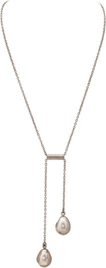 - Material: Silver rhodium-plated brass with rhodium dipped baroque shell pearls.