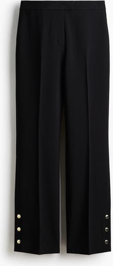 Trousers in woven fabric featuring a high waist with a zip fly and an extended waistband with a concealed button and hook-and-bar fastener. Diagonal side pockets, welt back pockets and bootcut legs with creases down the front and back and a slit with press-studs at the hems.