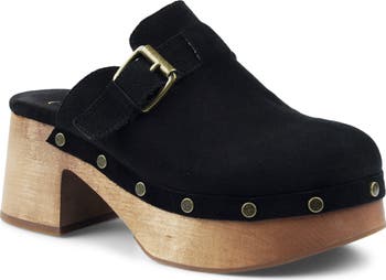 Polished rivets highlight the wood-grain platform of this retro-chic clog.