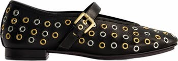 Functional flair and timeless fun. This ballet flat features a classic round toe and a Mary Jane adjustable strap for a secure, walkable fit. Scattered grommets/eyelets add a playful yet refined touch, making this shoe both an accessory and a statement.