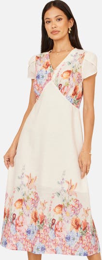 This elegant piece features a soft, feminine silhouette with a beautifully placed floral print that highlights the neckline and hem. The V-neck bodice creates a flattering shape, while the smooth, flowing skirt drapes gracefully for an effortlessly refined look. Perfect for daytime events or warm-weather occasions, it blends comfort with timeless charm.
