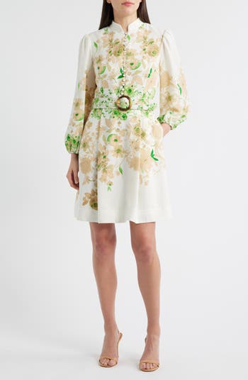 Painterly blooms romance this sophisticated puff-shoulder dress designed with elegant bezeled buttons and a defining ring belt.