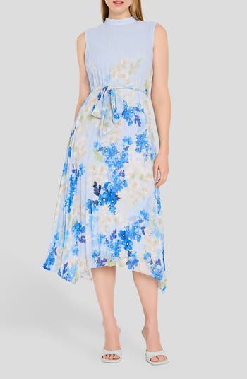Allover pleats add texture and movement to this sleeveless midi made with a defining tie belt and finished with a drapey handkerchief hem.