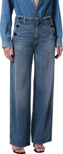 Button-trimmed pockets detail trouser-style jeans that will keep you look sharp with lightweight denim and a wide-leg silhouette.