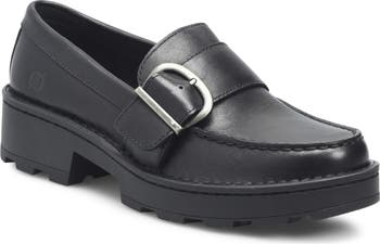 A brassy goldtone buckle anchors the wide strap of a polished, lightweight leather loafer completed by a grippy lugged sole.