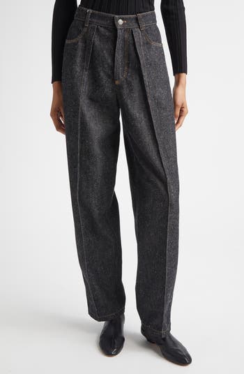 Snowy flecks speckle the dark, rigid denim of these high-waisted barrel-leg pants sewn with wide stitched-down pleats that taper into a center pintuck, extending to the tapered cuffs.