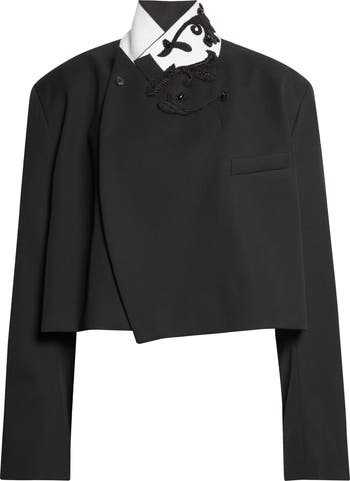 Coils and loops of embroidered cording and jet-black beads borrow from the Victorian era on this boxy wool gabardine jacket with an unexpected asymmetric closure that's thoroughly modern. A peaked lapel extends to button across the body instead of being folded back, exposing the contrast undercollar for a deconstructed aesthetic. The embroidery extends down from the collar and over the seams to the body panels, as if plotting its own course.