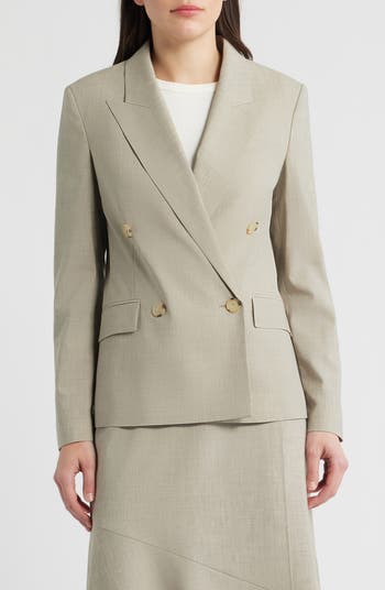 Smart and versatile, this [eaked-lapel blazer tailored from virgin wool features a double-breasted silhouette that will complement any semiformal look.
