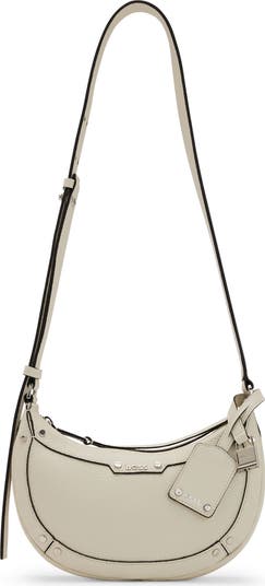 Gleaming hardware illuminates a hobo bag crafted from grained leather with a small interior for essentials only.