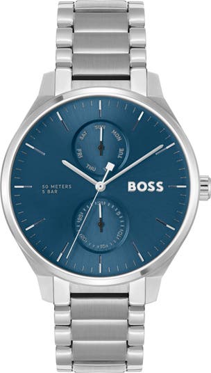 Functional sub-eyes and a streamlined silhouette enrich a sophisticated timepiece set on a stainless steel bracelet.