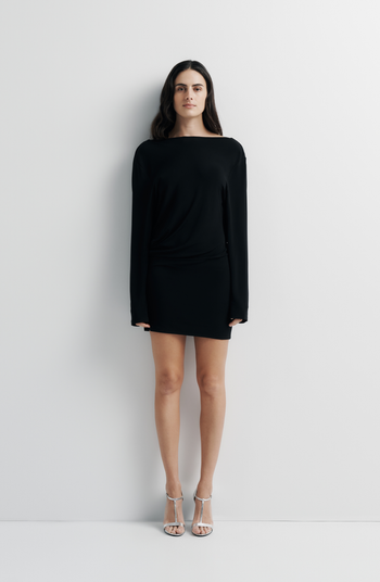 Fitted mini dress in fluid jersey with boat neckline and long sleeves. Features deep drape open back and pleated front detail.